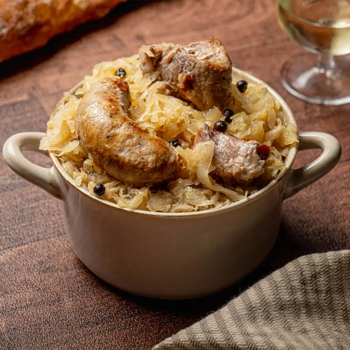 Chou cuisiné 46%, jarret de porc 24% (ES), saucisse de Toulouse 20% (FR) ( viande et gras de porc, sel, poivre), sauce: vin blanc*, eau, graisse de canard, bouillon de volaille-bœuf ( sel, amidon de maïs, exhausteur de gout: glutamate, sucre, extrait de levure, huile d’olive, graisse de poulet, poulet déshydraté, oignon, arôme, colorant: caramel, curcuma, ail), genièvre, poivre. *SULFITES