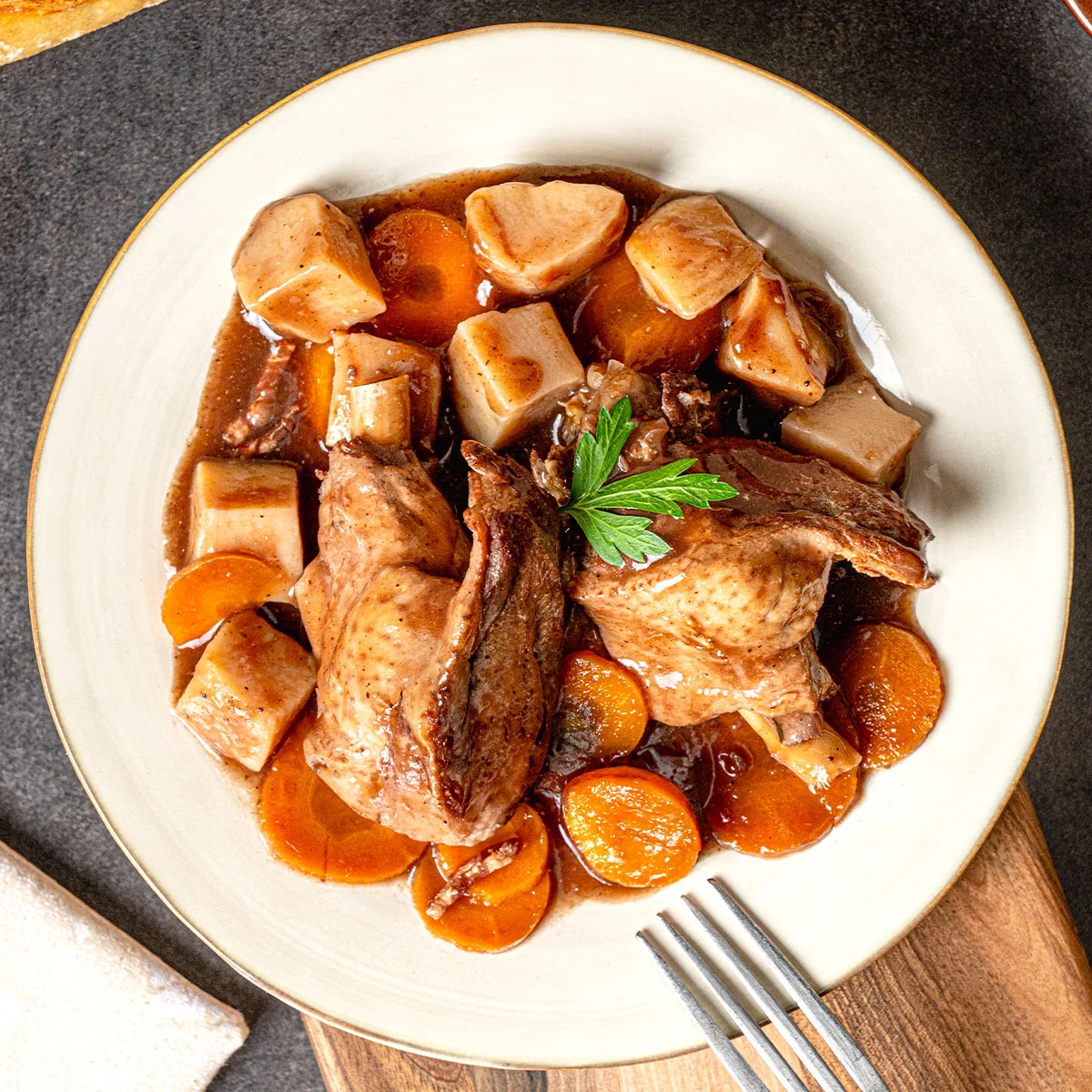 Le bon goût du terroir! Le canard est préparé dans une sauce légère et onctueuse, composée de vin rouge, oignon, et accompagné de pommes de terre et carottes. Il prend merveilleusement place sur vos tables et s’accompagne parfaitement de cèpes cuisinés, pommes de terre vapeur ou pâtes fraîches.