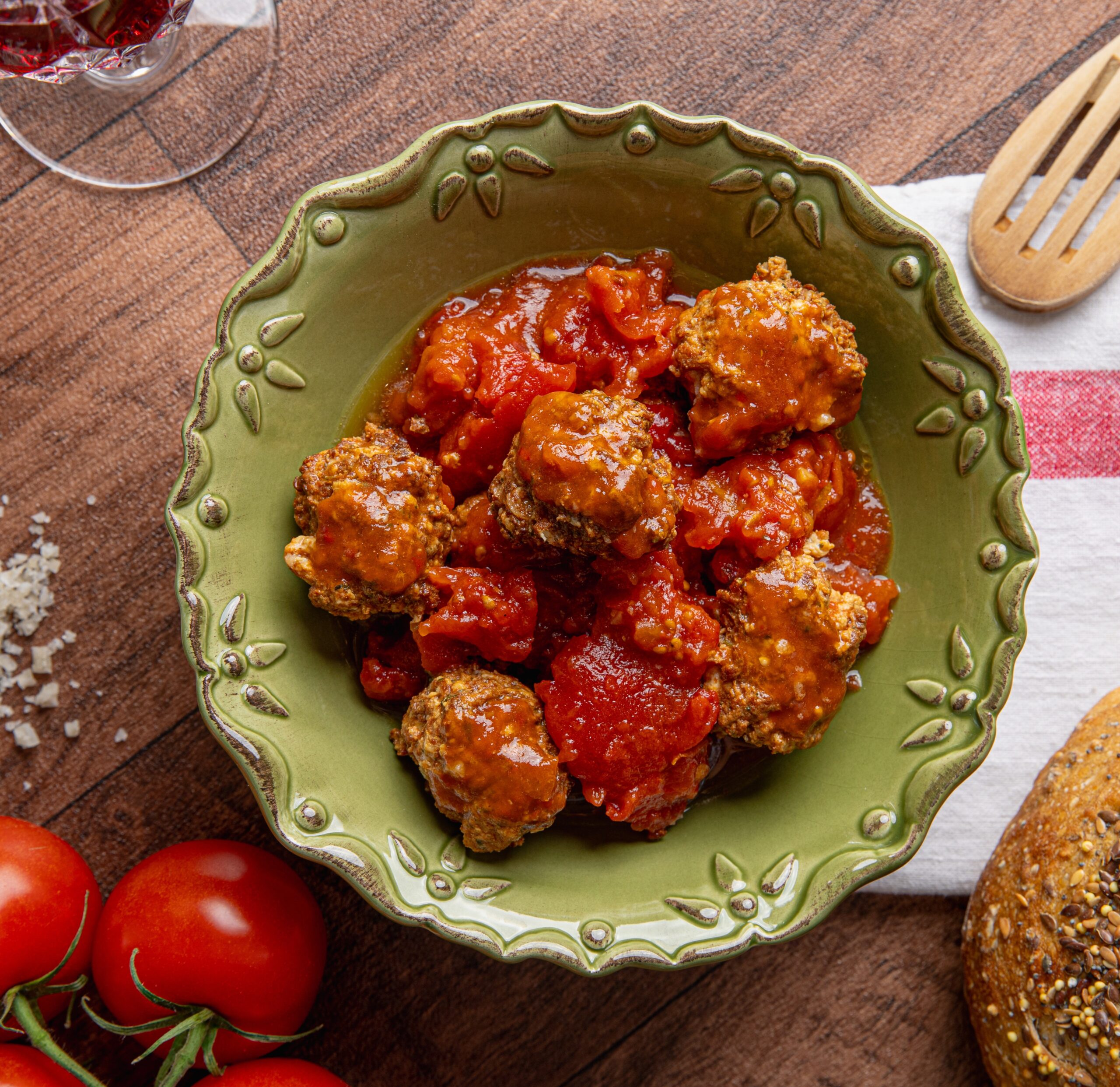 Boules de farces 40% (chair de porc 50% (UE), chapelure*, OEUFS, oignon, ail, persil, poivre, huile de tournesol), tomates entières pelées 33%, champignons de Paris, olives noires, sauce: eau, tomates concentré de tomate oignon, tomate séchée, sucre ail, bouillon de bœuf (sel, amidon de maïs, exhausteur de goût: E621, sucre, extrait de levure, huile d’olive, oignon, arôme, colorant: caramel, curcuma), amidon de maïs, thym, poivre. *SOJA, GLUTEN