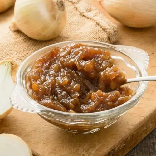 Oignons 80%, eau, caramel (sucre, eau), sucre, vin blanc (SULFITE), huile de tournesol, vinaigre de vin (SULFITES), miel, jus de citron concentré, sel, poivre.