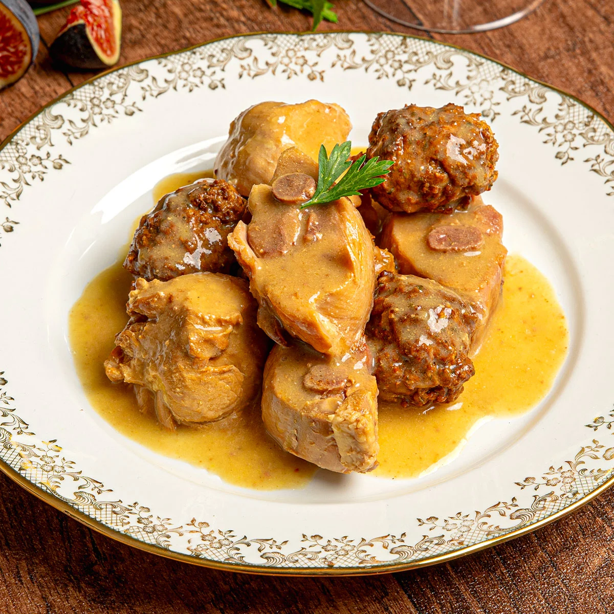 Chapon (ES), boules de farce 25% (chair de porc 80% [ES], chapelure*, OEUFS, oignon, ail, persil, poivre, huile de tournesol figues 1%), sauce: eau, vin blanc*, CREME FRAÎCHE, foie gras 4%, bouillon de volaille (sel, amidon de maïs, exhausteur de goût: glutamate, sucre, extrait de levure, huile d’olive, poulet, oignon, arôme naturel, curcuma, ail), BEURRE, arôme de foie gras, color grill, sel, poivre. *GLUTEN **SULFITES