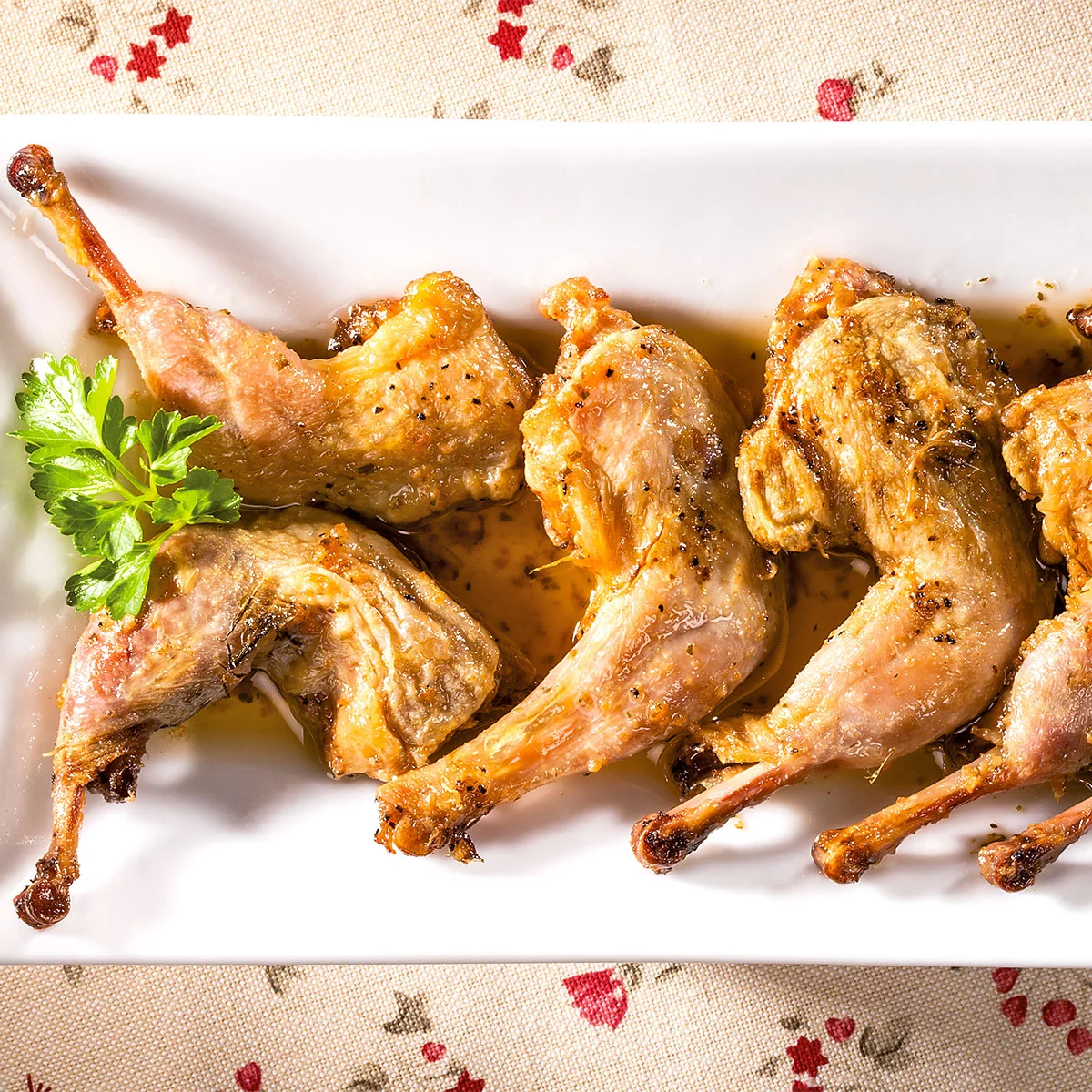 Pour un apéritif original et convivial! 6 délicieuses cuisses de caille cuites et assaisonnées avec de l’huile d’olive, ail, persil, poivre… une véritable fusion de saveurs pour un apéritif goûteux, entre amis ou en famille.