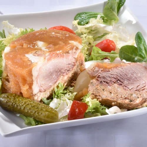 Jarret de porc (ES) 48%, farce (viande de porc (ES) 70%, Cèpes 8.7%, champignons de Paris, OEUFS, arôme cèpes, sel, poivre, oignon, CHAPPELURE), gelée.