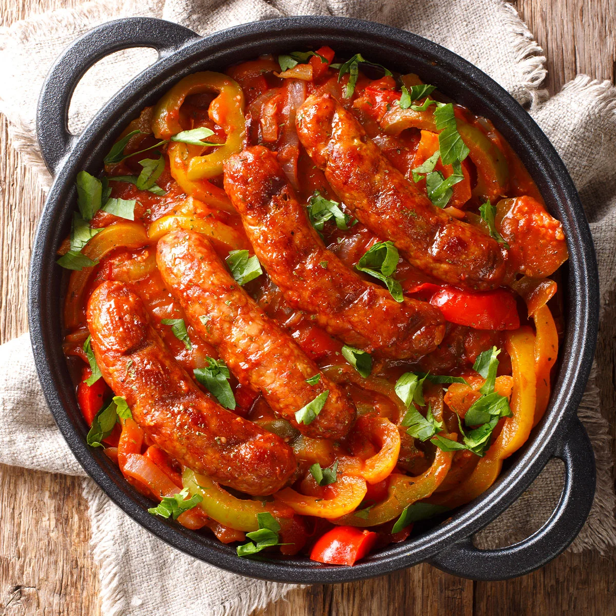 Un plat parfaitement harmonieux! La saucisse de Toulouse (composée uniquement de porc, sel et poivre) est cuisinée avec ses légumes du soleil, aubergine, poivron, tomate, et du thym. Ce plat classique ne manquera pas de vous surprendre.